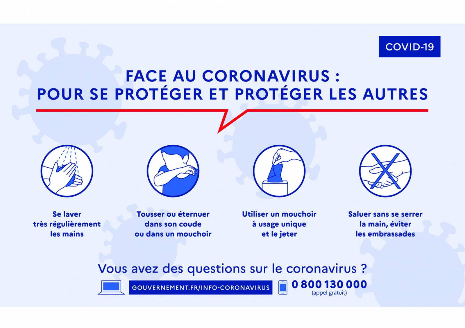 Pour de plus amples renseignements sur la situation en France, le gouvernement a mis en place un site d’informations mis à jour quotidiennement : https://www.gouvernement.fr/info-coronavirus